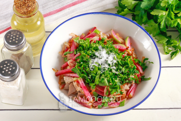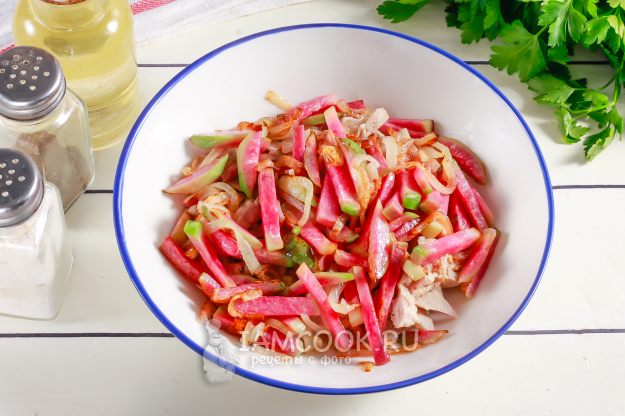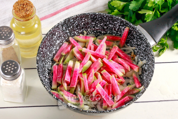 В это время очистите редьку от кожуры и промойте в воде. Лучше всего для салатов использовать арбузную редьку - она не такая горькая на вкус. Нарежьте плод брусочками и выложите на сковороду. Перемешайте и обжарьте вместе с луком еще 2-3 минуты - до легкой румяности.