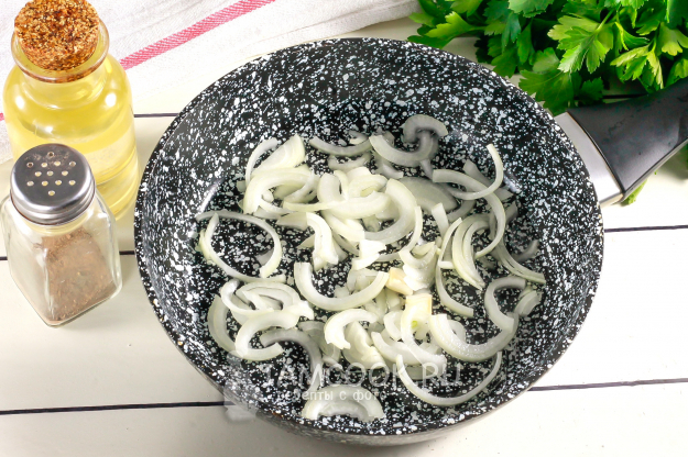 Нарежьте помытую луковицу полукольцами и отпассеруйте в сковороде примерно 2-3 минуты на умеренном огне, влив в емкость растительное масло.