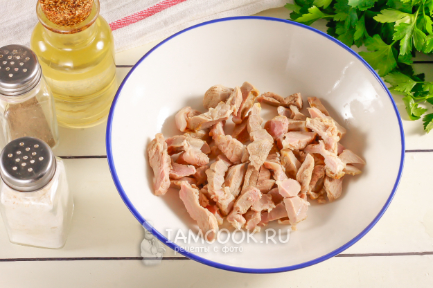 Отварное мясо нарежьте небольшими кусочками или брусочками. Пересыпьте нарезку в глубокую емкость, салатник.
