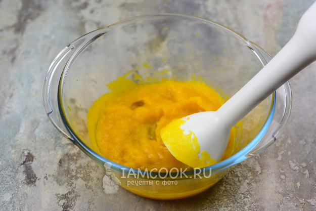 Запеченную тыкву выложим в миску и перебьем погружным блендером до получения однородного пюре.