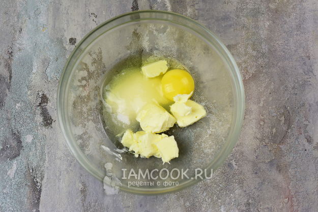 В отдельную миску выложим мягкое масло, сахар и вобьем яйцо.