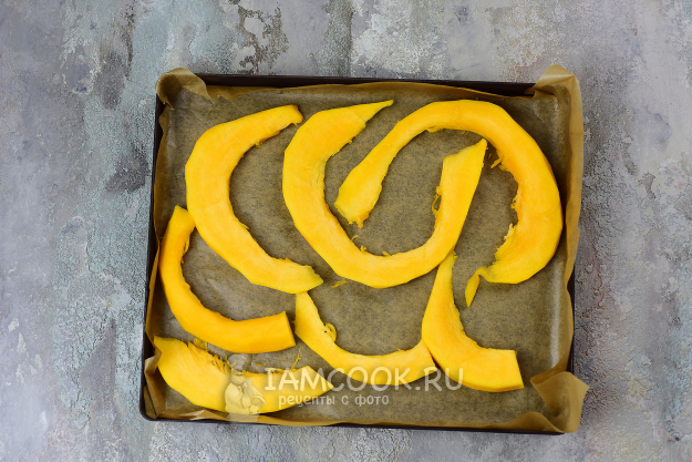 Тыкву нарежем на тонкие ломтики, выложим на противень, застеленный пергаментом для выпечки, отправим выпекаться в духовку при температуре 200 градусов до мягкости - это примерно 10 минут.