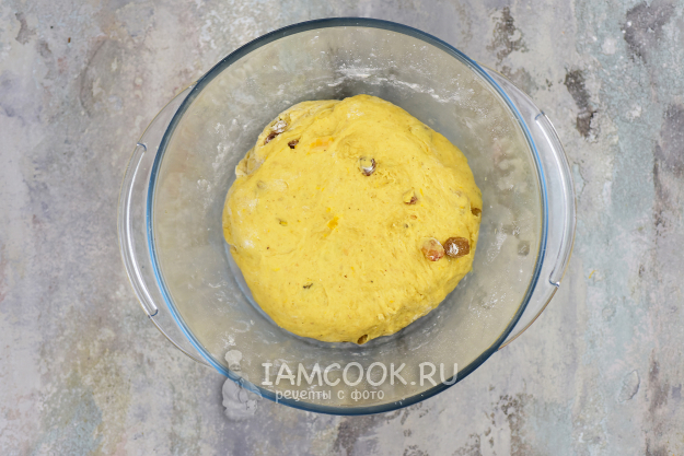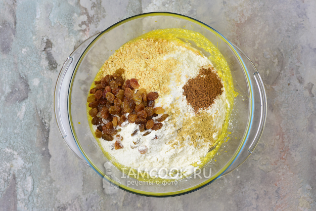 К полученной однородной массе добавим муку, соль, разрыхлитель, мускатный орех, молотый имбирь, изюм и измельченный миндаль.