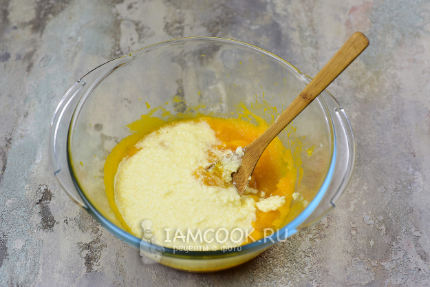 Масляную смесь добавим в миску к тыквенному пюре и все перемешаем до полного соединения смесей.
