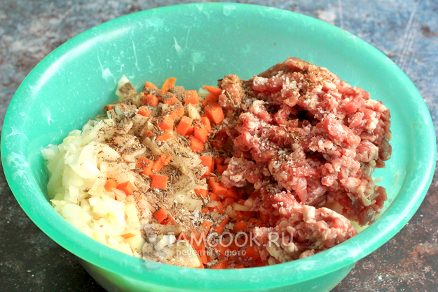 Добавьте жирную баранину, перец, зиру и соль. Хорошенько перетрите начинку руками.