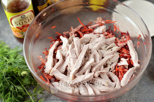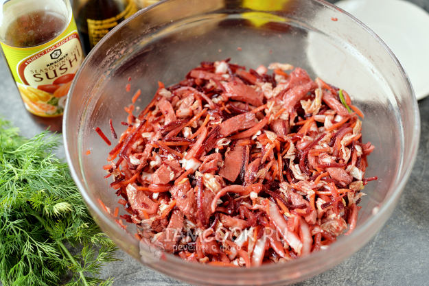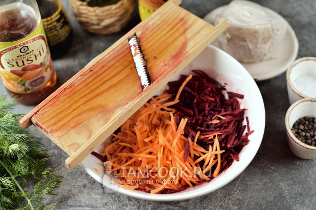 На специальной терке натрите свеклу и морковь тонкой соломкой прямо в глубокую миску.