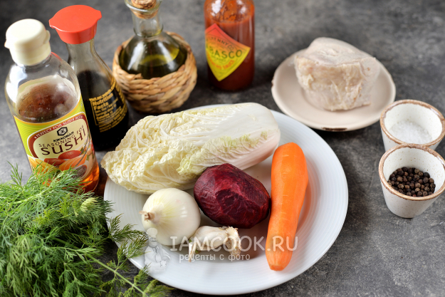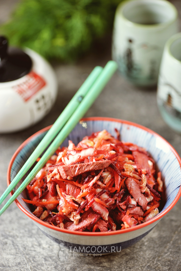 Возьмите все продукты для салата «Китайский дракон» с мясом и пекинской капустой. Лук, чеснок, морковь и свеклу почистите и помойте под проточной водой вместе с пекинской капустой. Все овощи обсушите насухо бумажными полотенцами. Свинину заранее отварите до готовности в чуть подсоленной воде, минут 20-25 вполне достаточно.