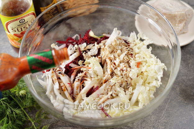 Влейте масло, соевый и острый соус, рисовый или винный уксус, всыпьте чуть свежемолотого перца.