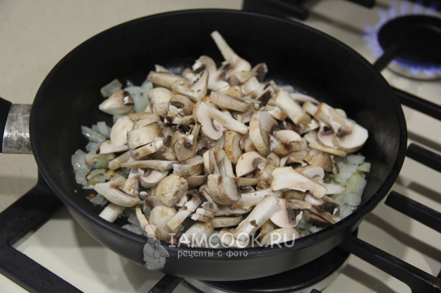 Грибы промыть под проточной водой и нарезать на пластинки. Добавить в сковороду к луку.