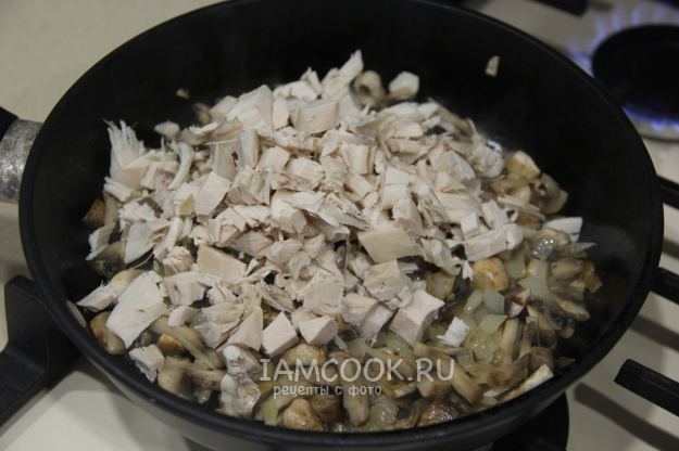 Обжарить грибы примерно 10-12 минут. Куриную грудку нарезать на кусочки или порвать на волокна. Добавить курицу в сковороду.