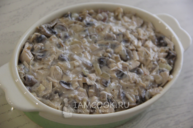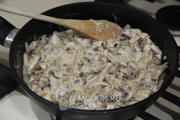 Перемешать грибы с курицей и сливками, потомить пару минут на медленном огне.