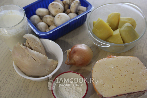 Подготовить продукты для запеканки-жульена с курицей и грибами. Картошку предварительно почистить и сварить до готовности в подсоленной воде. Куриное филе сварить до готовности, я отварила куриную грудку в течение 20 минут.
