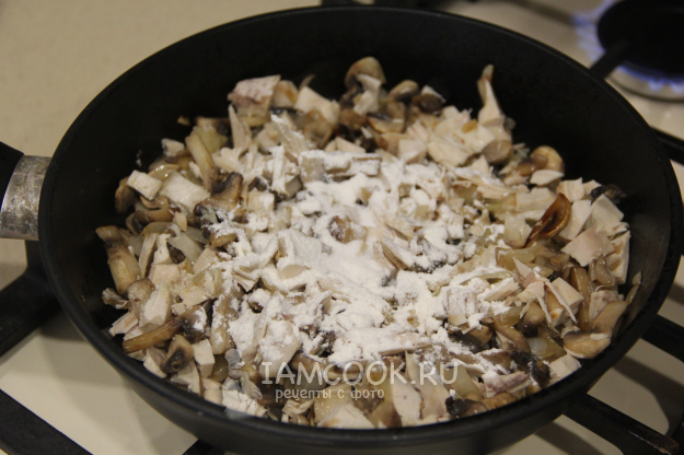 Посолить начинку по вкусу, всыпать муку, перемешать. Влить сливки.