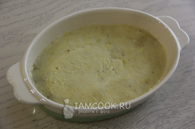 Картофель размять толкушкой или вилкой. Выложить на дно формы и разровнять. У меня форма продолговатая - 23 см в длину.