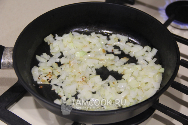 В сковороду влить масло. Лук почистить и мелко нарезать. Обжарить лук на сковороде до золотистого цвета.