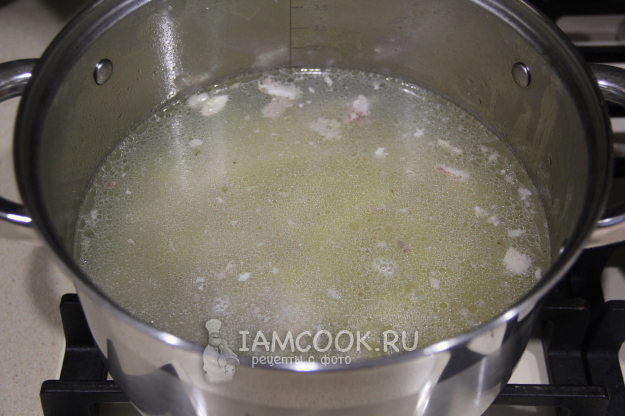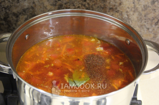 Затем посолить суп, добавить лавровый лист и специи по вкусу.