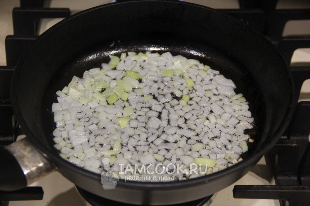 Пока варится картошка, приготовить овощную зажарку. В сковороду влить немного масла и добавить мелко нарезанный лук. Обжарить лук в течение 5 минут.