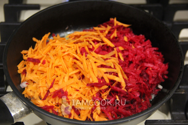Свеклу и морковь натереть на терке и добавить в сковороду к луку.