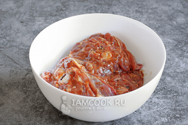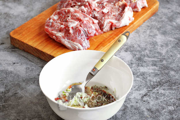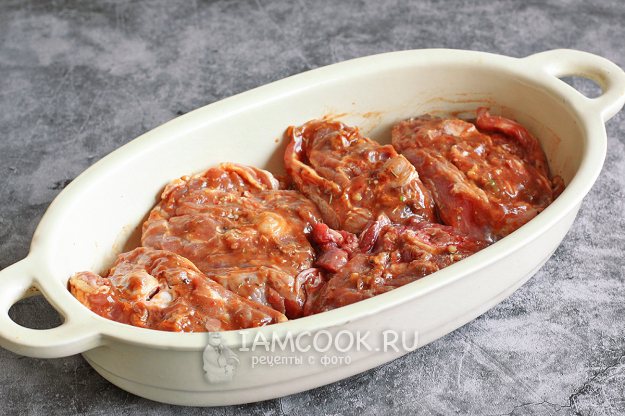 Стейки бараньей шеи смажьте маринадом и оставьте на 1 час промариноваться. Емкость накройте крышкой или пленкой.