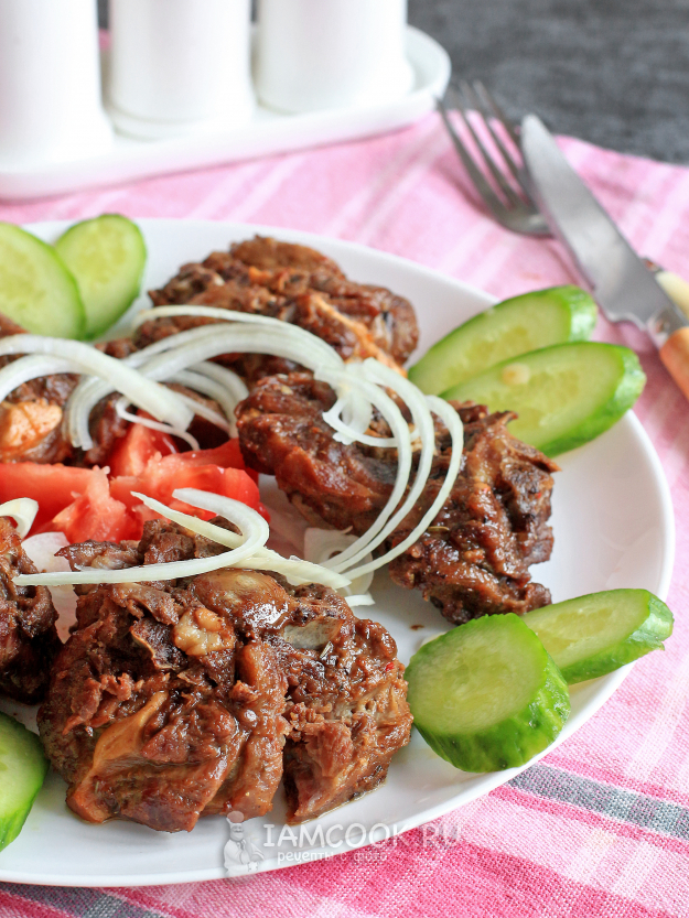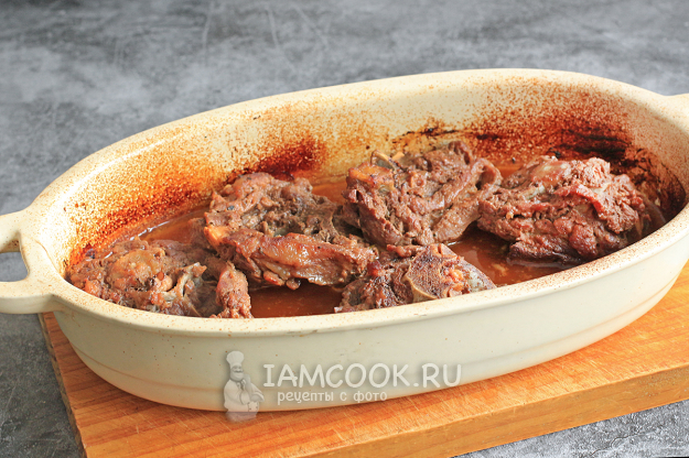 Огнеупорную форму смажьте маслом и выложите в ряд стейки бараньей шеи. Накройте форму фольгой и запекайте в разогретой до 160 градусов духовке три часа. Периодически проверяйте мясо на мягкость, и если необходимо, понемногу добавляйте горячую воду.