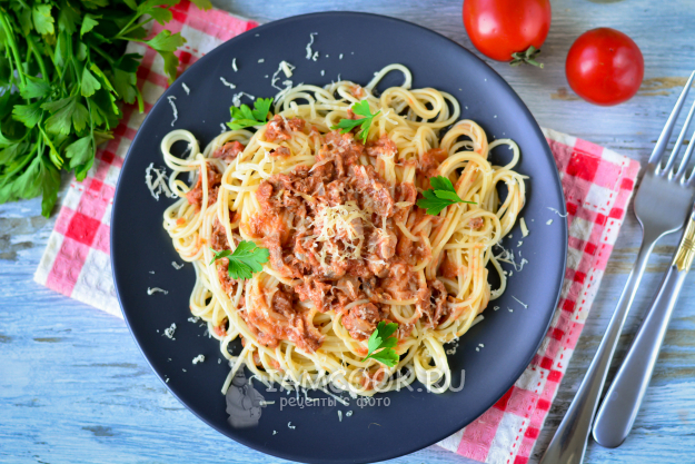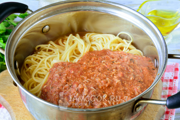 Влейте к спагетти томатный соус с тунцом и перемешайте.
