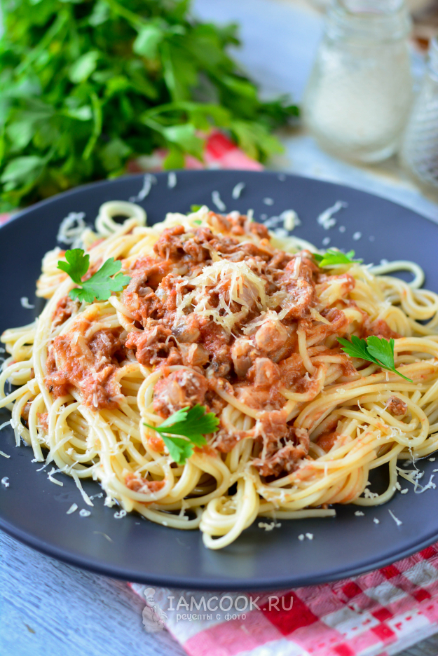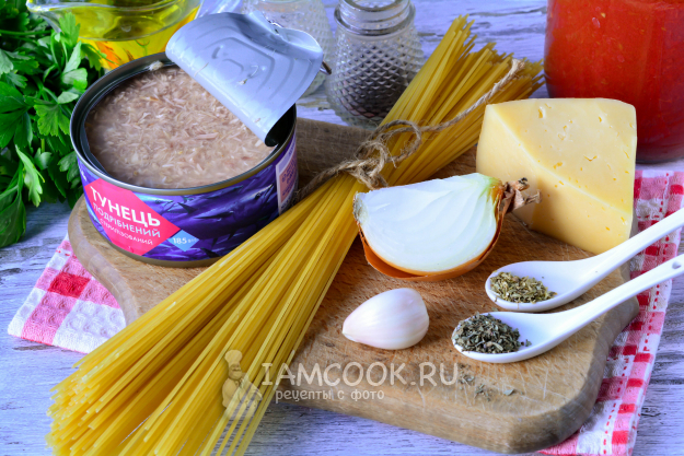 Возьмите ингредиенты для приготовления пасты (спагетти) с консервированным тунцом в томатном соусе.