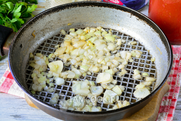Налейте оливковое масло на сковороду, всыпьте лук и чеснок, обжаривайте пару минут.