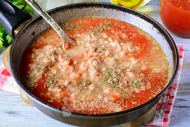 Добавьте соль и черный перец по вкусу, всыпьте сушеный базилик и орегано.