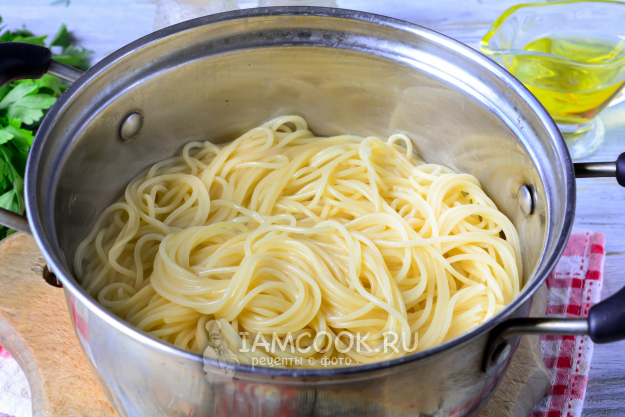 Вскипятите 1 л воды, добавьте чуть соли и выложите спагетти. Размешайте и варите пасту 7-8 минут.