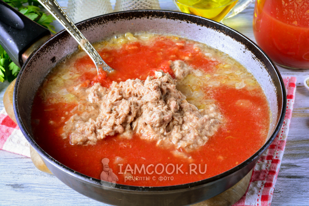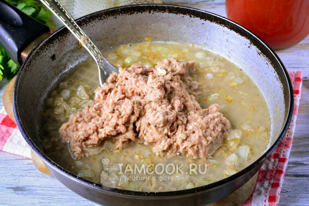 Затем добавьте в сковороду измельченного тунца с соусом.