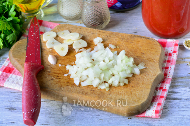 Пока варится паста, приготовьте соус. Почистите лук и чеснок. Лук нарежьте мелкими кубиками, а чеснок - средними пластинками.