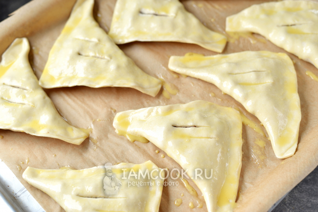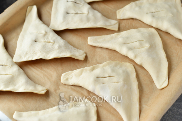 Сложите тесто треугольником, защипните края, сделайте несколько надрезов сверху на заготовке. Переложите пирожки на противень вместе с пергаментом.