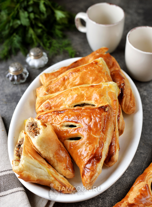 Щедро смажьте все заготовки взбитым яйцом. Выпекайте пирожки из слоеного теста с печенью в предварительно разогретой до 190 градусов духовке 20 минут в режиме верхнего и нижнего нагрева. Противень установите ровно посередине духовки.