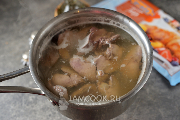 Вскипятите в сотейнике воду, чуть посолите, выложите куриную печенку и отварите ее не дольше 5 минут.