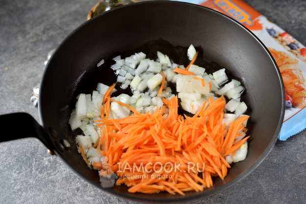 Параллельно поставьте обжариваться лук с морковью на растительном масле, жарьте овощи минуты 3-4 до мягкости.