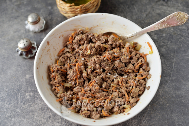 Начинку посолите и поперчите по вкусу, слегка разотрите тыльной стороной ложки.