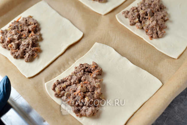 Каждый квадрат теста слегка раскатайте скалкой, на одну половину положите начинку из печени.