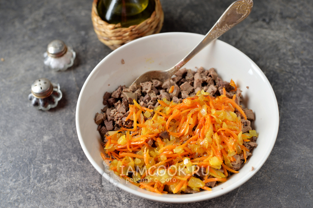 Печень порубите мелко ножом или пропустите через мясорубку с крупным решетом, в блендере лучше не пробивать, поскольку у вас получится паштет. Добавьте к печени обжаренные овощи, перемешайте.