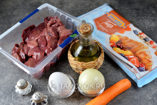 Возьмите все необходимые продукты для приготовления слоеных пирожков с печенью. Печень помойте, обрежьте все пленки и жир, разморозьте тесто, почистите и помойте лук с морковью. Тесто я взяла слоеное дрожжевое, но и из обычного пресного пирожки получатся тоже отличными.