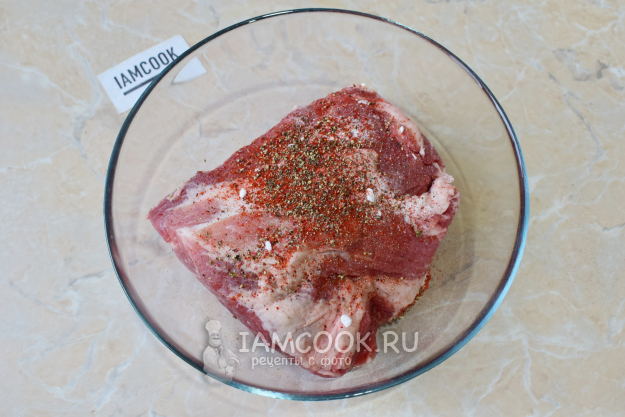 Кусок мяса обсыпьте солью и специями и вотрите их тщательно со всех сторон. В качестве специй я беру молотый перец, немного паприки и сушеный базилик.