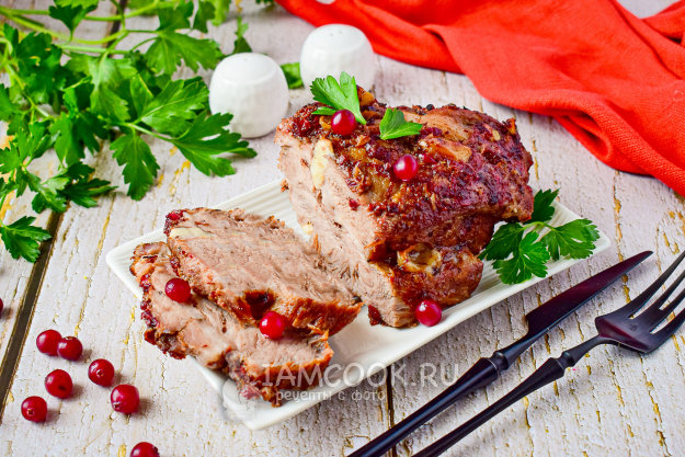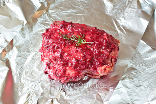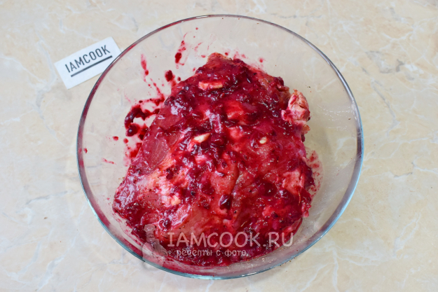 Клюквенным соусом обильно смажьте мясо со всех сторон. Оставьте мариноваться хотя бы на час.