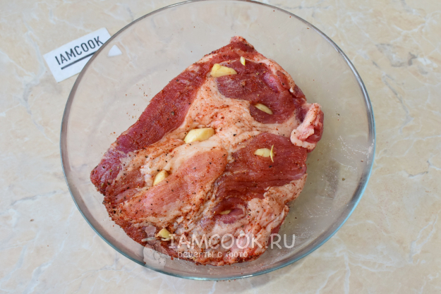 Зубчики чеснока очистите от шелухи и ополосните. Крупные зубчики можно разрезать на 2-3 части. В мясе сделайте проколы ножом и вставьте чеснок. Он придаст мясу приятный аромат.