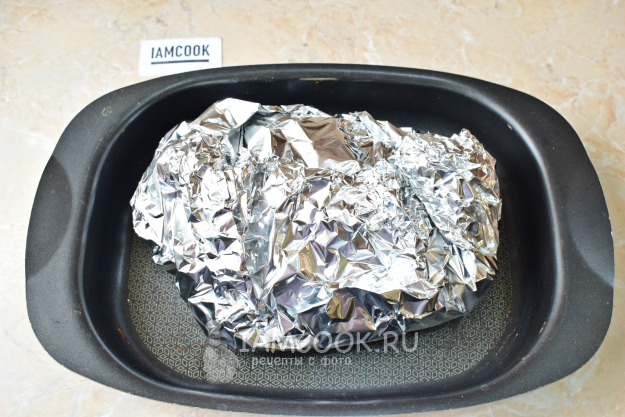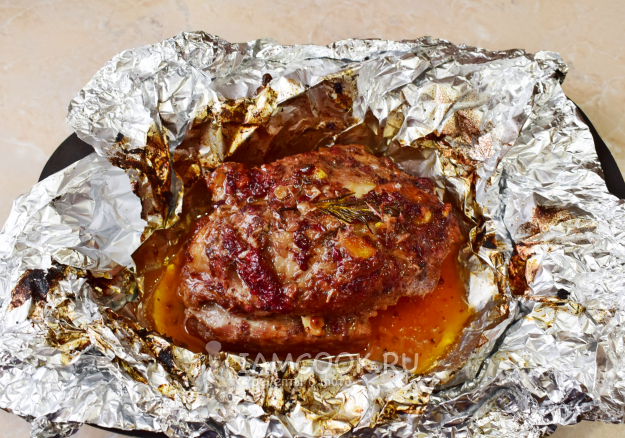 Заверните мясо в фольгу и выложите на противень. Разогрейте духовку до 200 градусов и запекайте мясо 1,5 часа.