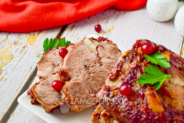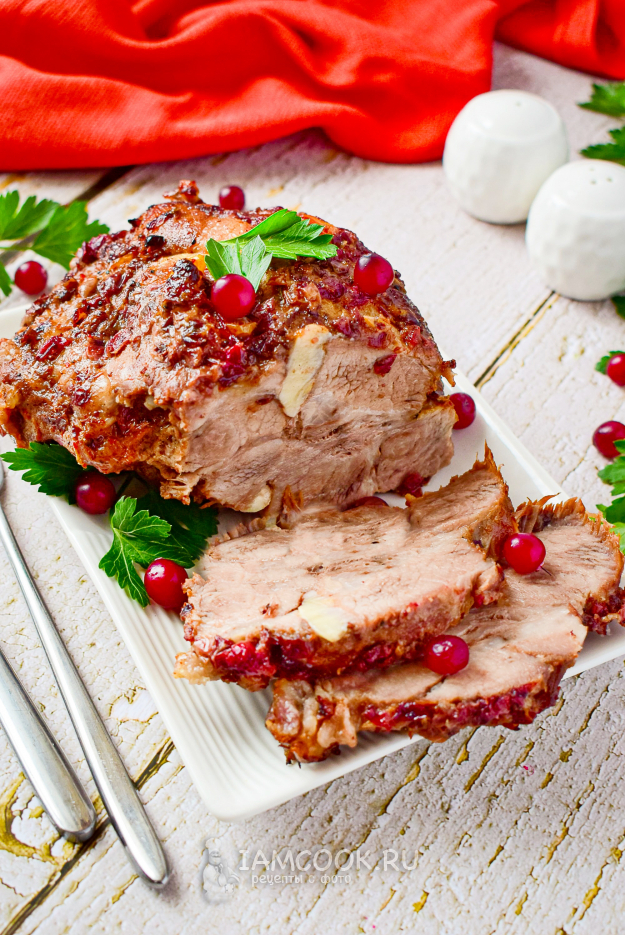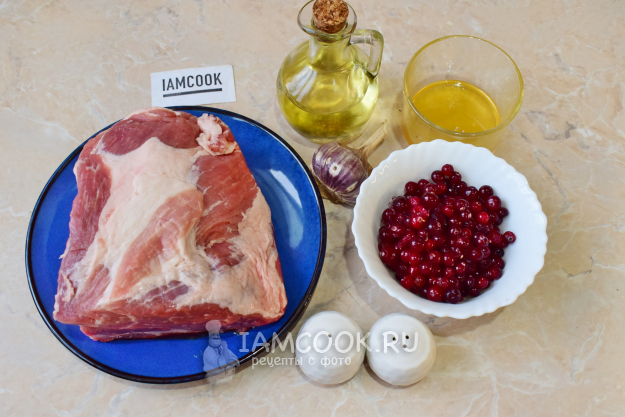 Для приготовления буженины с клюквой и мёдом в духовке необходимы следующие ингредиенты. Для запекания можно использовать любую часть свинины без костей. Я беру свиную шею. В таком мясе есть немного жира, благодаря чему готовое блюдо будет мягким и сочным. Клюква может быть как свежая, так и замороженная. Замороженную необходимо предварительно разморозить.