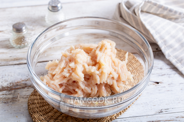 Филе курицы помойте под проточной холодной водой и обсушите полотенцами. Нарежьте филе крупными кусочками и вместе с очищенным луком измельчите в мясорубке.