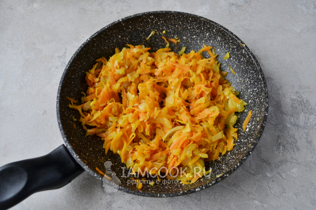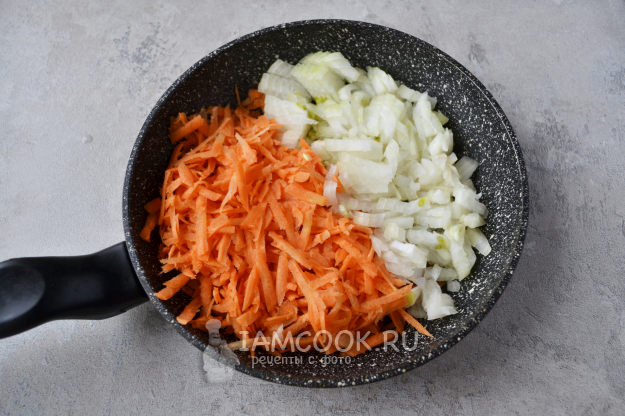 Очищенную морковь натрите на крупной терке. Репчатый лук очистите и мелко нарежьте. Разогрейте сковороду с растительным маслом и положите в нее лук и морковь.