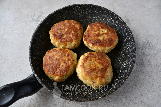 Разогрейте сковороду с растительным маслом и отправьте на нее запанированные котлеты. Сделайте огонь минимальным и под крышкой обжаривайте котлеты до румяной корочки - примерно по 12-15 минут с каждой стороны.