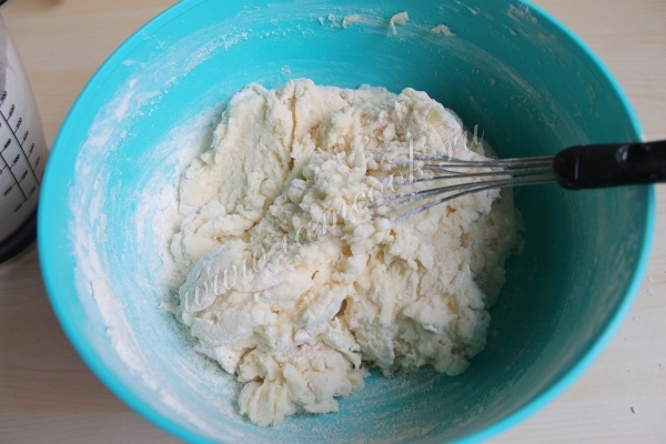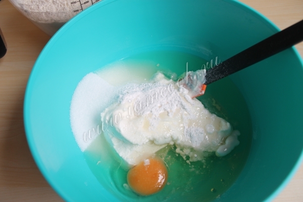 Смешаем жидкий творог, яйцо, масло, сахар, соль, разрыхлитель.