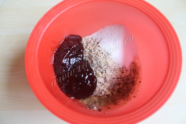 Для начинки смешаем молотые орехи,любые, с повидлом, сахаром и белком.