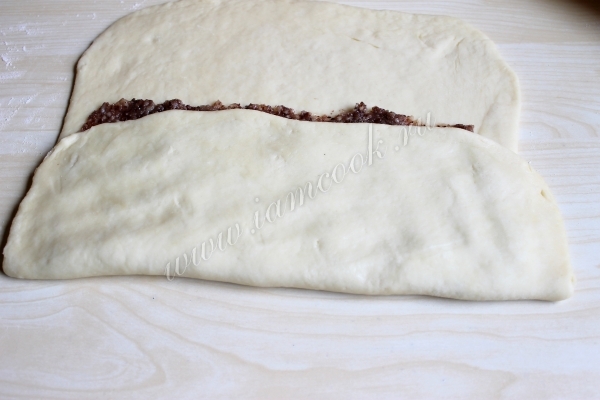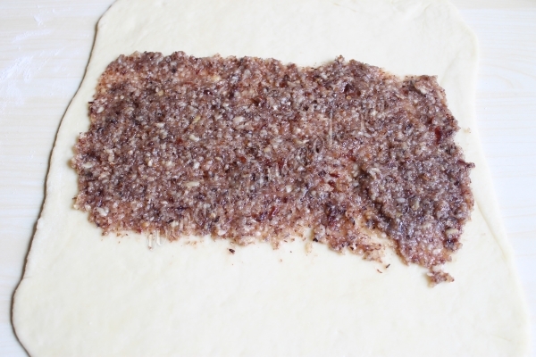 Готовое тесто делим на две части. Раскатываем одну в прямоугольник. Толщиной 0,5 см. Выкладывае начинку на середину пласта. Разравниваем ее.